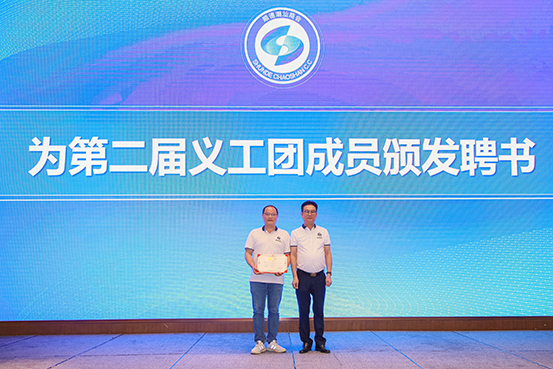常務副會長 呂義勝(右)為第二屆義工團團長吳少東(左)頒發聘書、授予義工旗幟