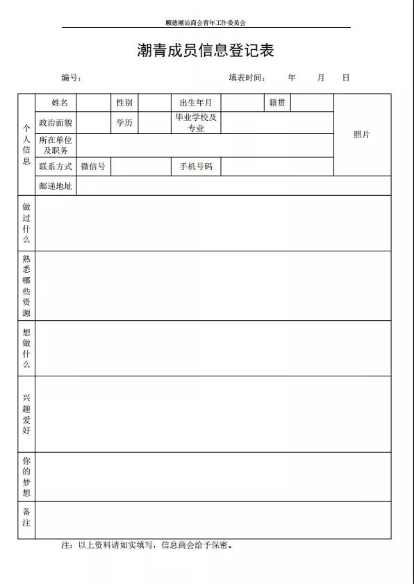 加入條件: (1)自愿加入本平臺(包括本機構(gòu)運營管理的微信群、QQ群等線上平臺); (2)45周歲以下的會員、會員企業(yè)代表(子女)或其他順德優(yōu)秀潮籍青年; (3)充滿正能量,擁有活躍開放的思想和觀念; (4)認同順德潮汕商會及本平臺的價值觀及理念; (5)熱愛生活,熱愛團體活動,擁有正當(dāng)職業(yè)的男女青年; (6)熱心投入本平臺的工作及積極參與活動; 加入流程: 自薦、內(nèi)部成員推薦加入——填寫信息登記表并提交相關(guān)資料——潮青委內(nèi)部審核資料——成為順德潮青成員 活動形式: (1)線上交流:建立“順德潮青交流微信群”,方便大家日常交流、資訊分享、活動報名等。后期根據(jù)具體需求再增加新的線上交流平臺; (2)線下交流:組織學(xué)習(xí)培訓(xùn)、分享沙龍、企業(yè)參觀、親子教育、外出旅行、考察、體育競賽等活動。 報名須知: 點擊下方下載“潮青成員信息登記表”,按要求填寫,并將表格及相關(guān)資料發(fā)送到郵箱3348066067@qq.com 聯(lián)系人:鄭漫紅 18098189099(微信同號) 注:以上資料如實填寫,商會將予以保密存檔。 加入順德潮青,始于緣分,持于信任。如果我們是志同道合的青年人,如果您的發(fā)展理念和我們的價值觀契合,那么歡迎您加入順德潮青,擼起袖子,一起拼!